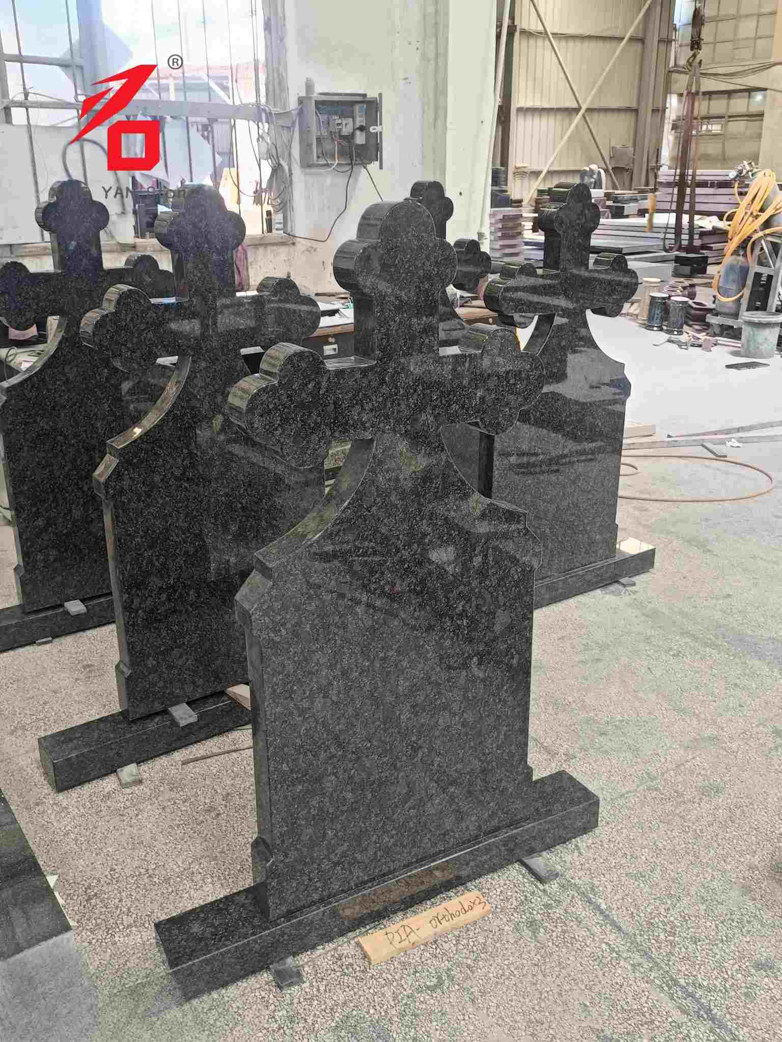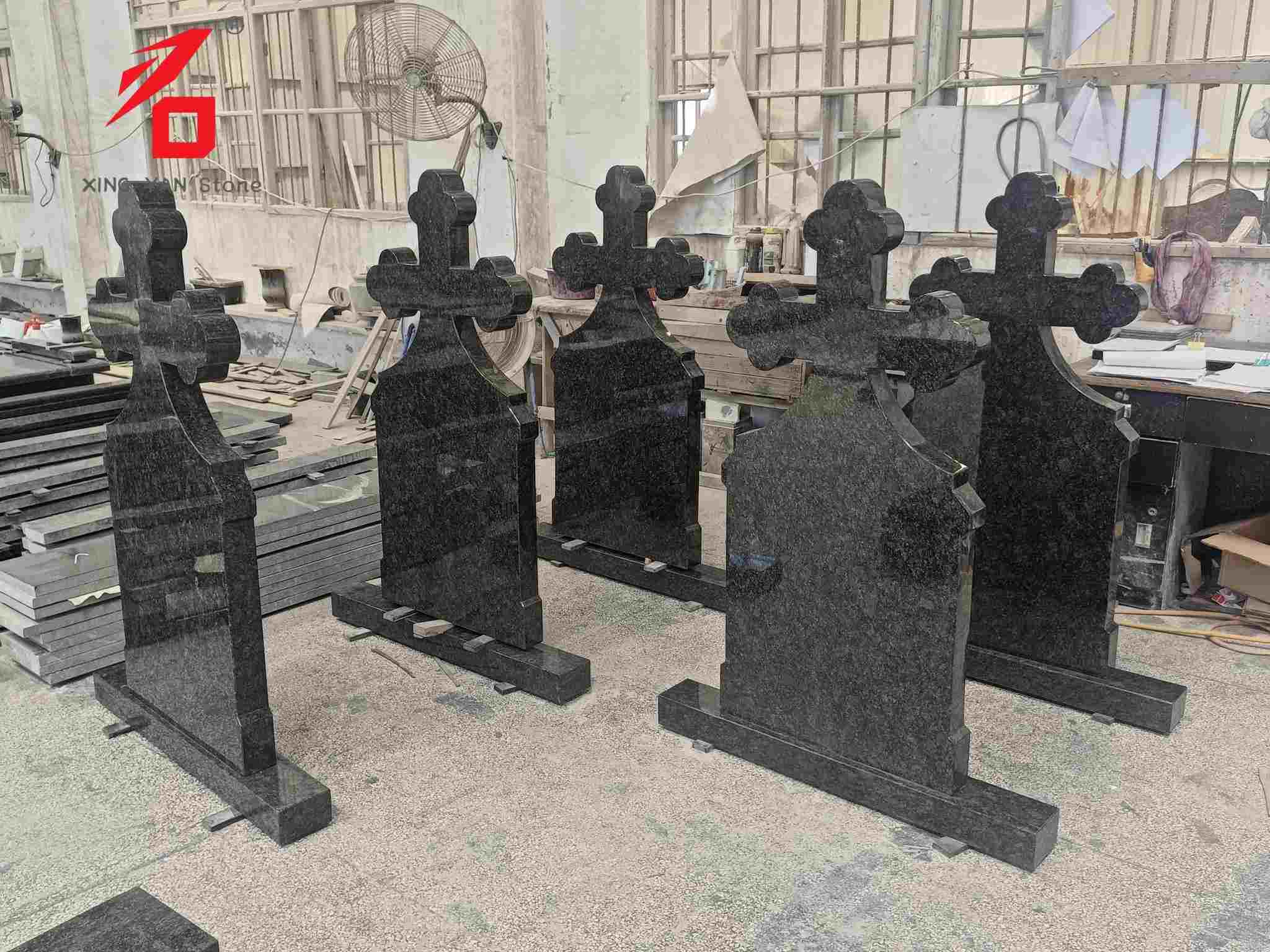 Bahan: Granit hitam dengan kepadatan tinggi dipilih, menampilkan sifat batu padat dan keras, tahan cuaca dan tahan erosi. Permukaannya mengalami perawatan pemolesan halus, menghasilkan kilap tinggi dan tekstur seragam. Dirancang untuk penempatan luar ruangan jangka panjang, tahan pudar dan berubah bentuk, memastikan daya tahan dan integritas visual batu nisan.